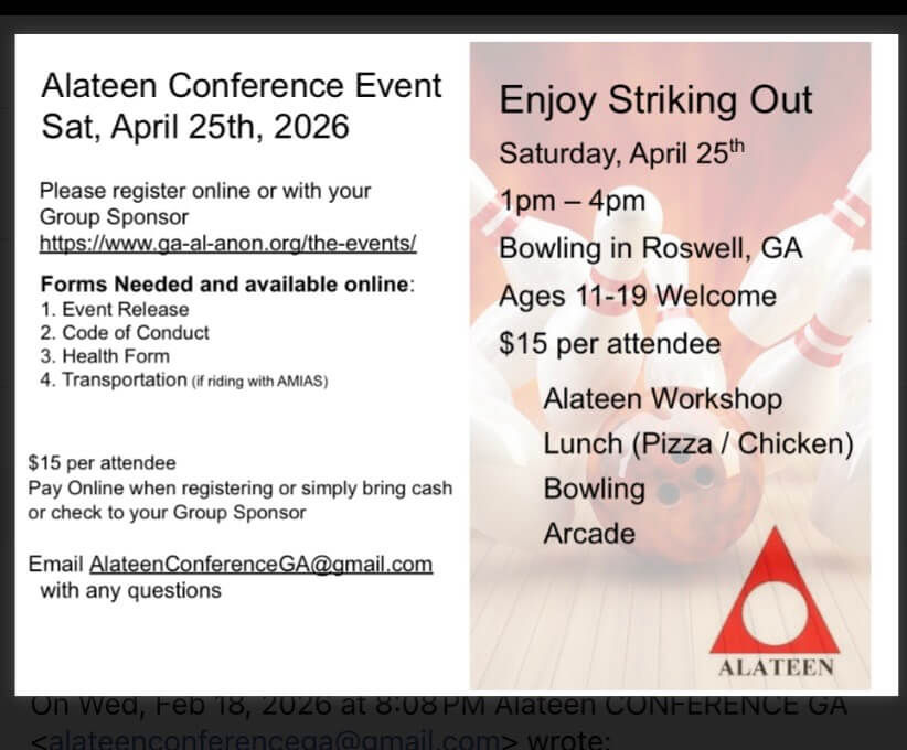 Enjoy Striking Out? Join this Alateen Conference Event - Bowling. Ages 11 - 19 are welcome. There will be an Alateen Workshop, Lunch (Pizza, Chicken), Arcade and of course Bowling.